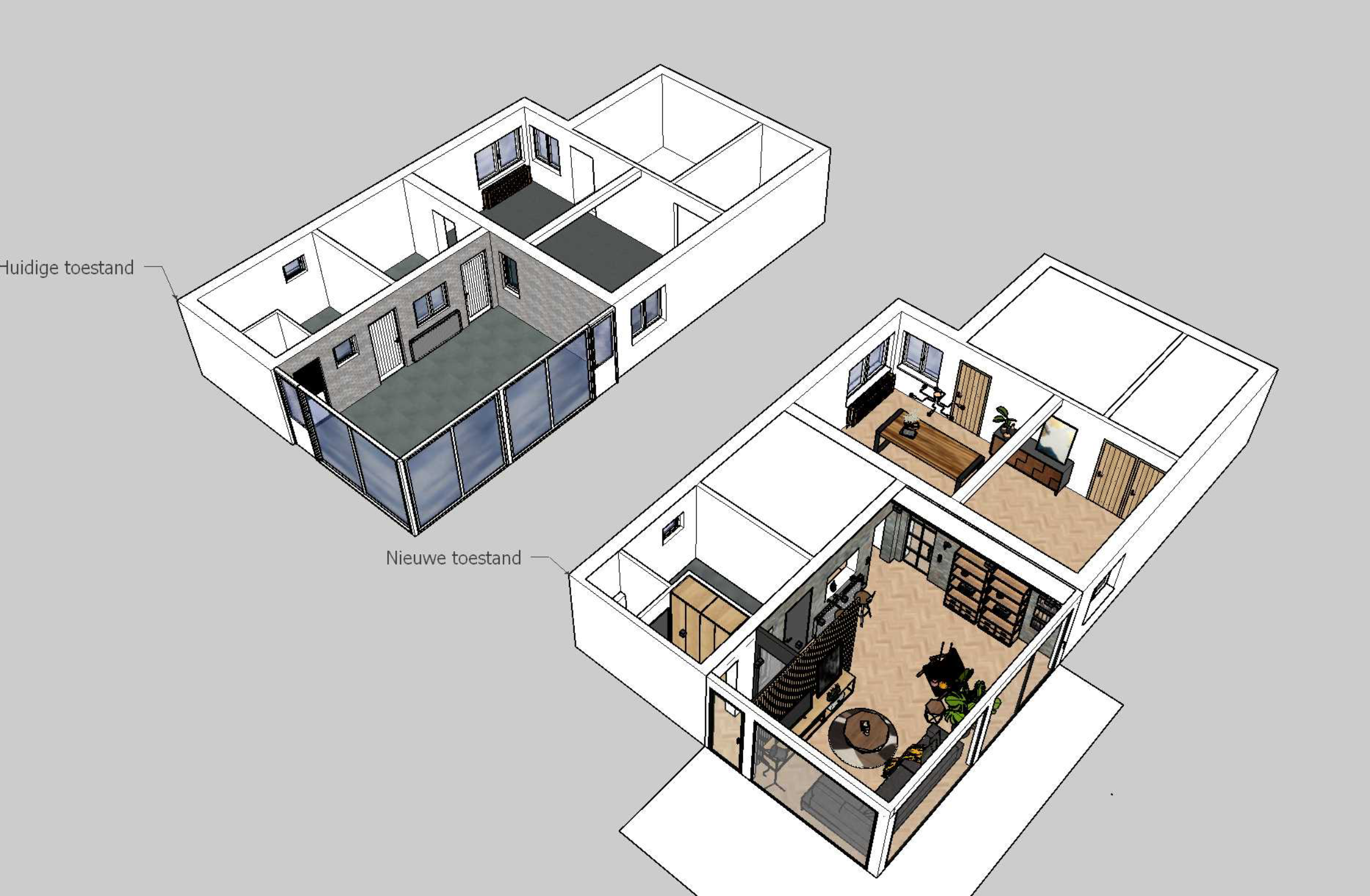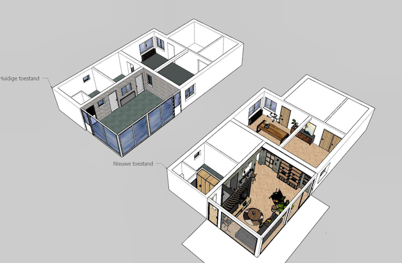 Voor dit project heb ik de renovatie van een leefruimte en veranda begeleid, waarbij ik verantwoordelijk was voor zowel het ontwerp. Het doel was om de twee ruimtes naadloos in elkaar te laten overgaan en een lichte, open sfeer te creëren. In nauw overleg met de klant heb ik een ontwerp gemaakt dat niet alleen praktisch is, maar ook het karakter van de woning versterkt.